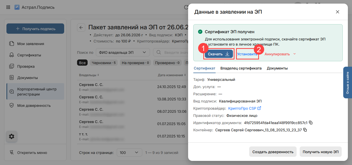 После проверки статус заявления поменяется с "Подготовка сертификата. Идет одобрение сертификата" на статус "Готово. Сертификат ЭП получен". Cкачайте сертификат, нажав кнопку Скачать (1). Для установки сертификата нажмите кнопку Установить (2):