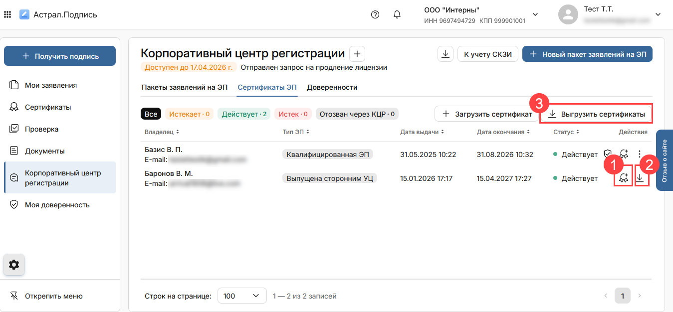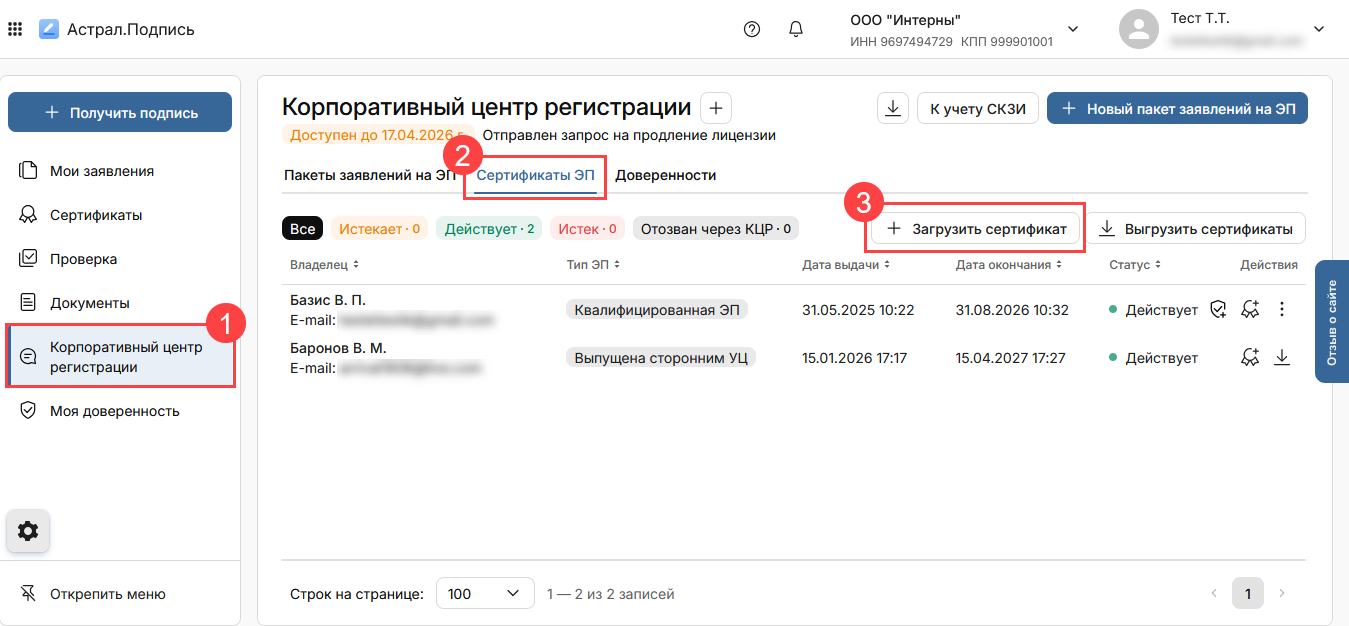 Чтобы в личном кабинете видеть все сертификаты, в том числе и сертификаты от других УЦ, можно загрузить все сертификаты ЭП в свой личный кабинет. Для этого перейдите в раздел Корпоративный центр регистрации (1) → Сертификаты ЭП (2) и нажмите кнопку Загрузить сертификат (3):