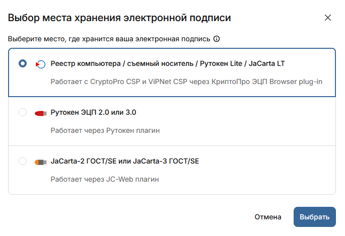 Выберите место хранения ЭП: