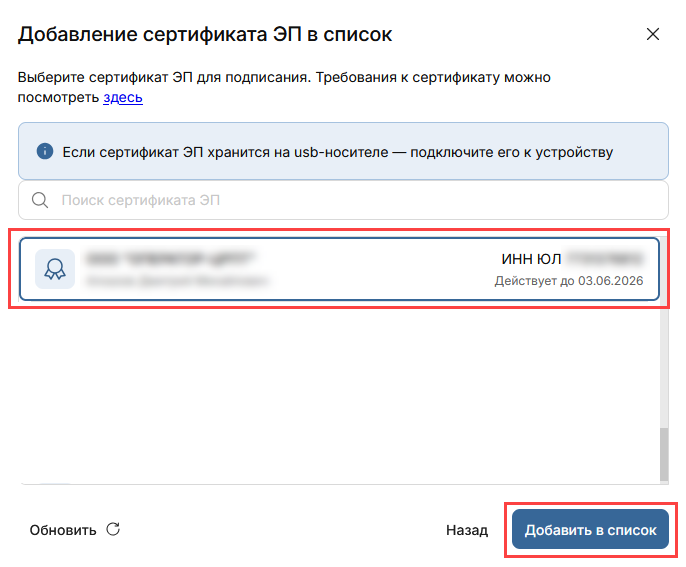 Если нужный сертификат не отображается, проверьте, подключен ли носитель с ЭП к вашему ПК. Если ЭП подключена к ПК, воспользуйтесь инструкцией Действия при ошибках криптографии.