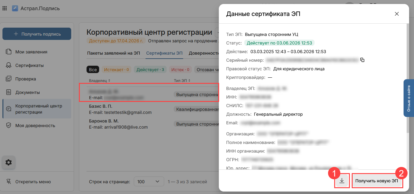 Чтобы посмотреть подробную информацию по загруженному сертификату, нажмите на сертификат в списке. Здесь можно скачать сертификат (1) и выпустить новую ЭП на основе выбранного сертификата (2):