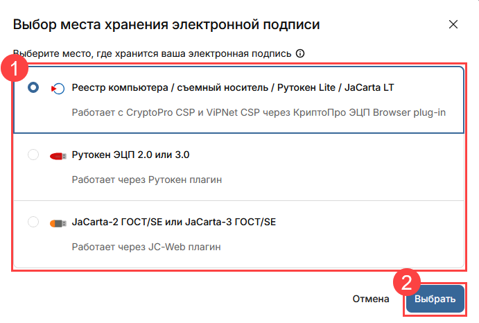 Выберите место хранения электронной подписи (1) и нажмите Выбрать (2):