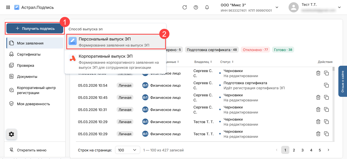 Для получения сертификата электронной подписи в личном кабинете Астрал Подпись нажмите Получить подпись (1) → Персональный выпуск ЭП (2):