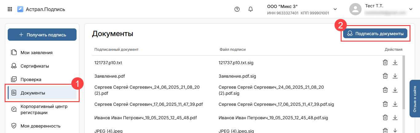 Перейдите в раздел Документы (1) и нажмите кнопку Подписать документы (2):