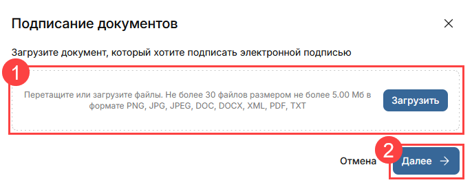 Загрузите файл приказа в окно для загрузки документов (1), после чего нажмите кнопку Далее (2):