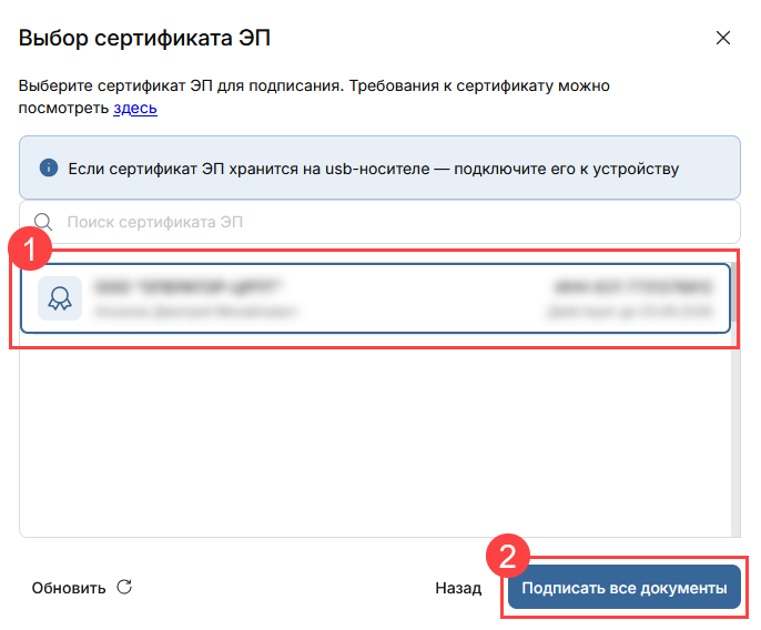 Выберите сертификат для подписания (1) и нажмите кнопку Подписать все документы (2):