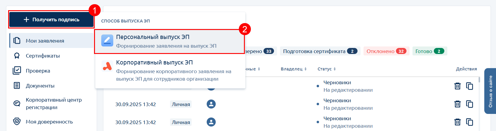 Для получения сертификата электронной подписи в личном кабинете Астрал Подпись нажмите Получить подпись (1) → Персональный выпуск ЭП (2):
