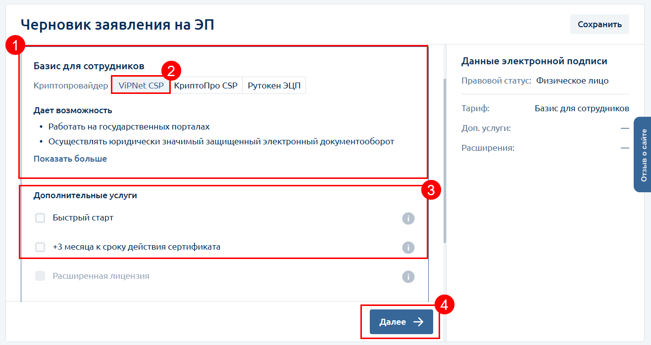 Выберите тариф Базис (1) (для работы с ФИС ФРДО используется базовая квалифицированная электронная подпись) и криптопровайдер VipNet CSP (2):
