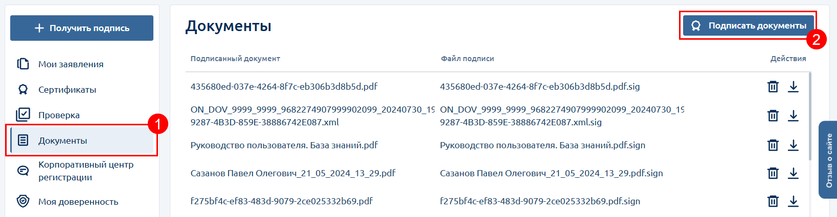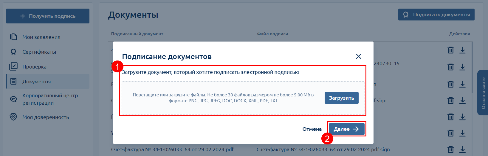 Перейдите в раздел Документы (1) и нажмите кнопку Подписать документы (2):