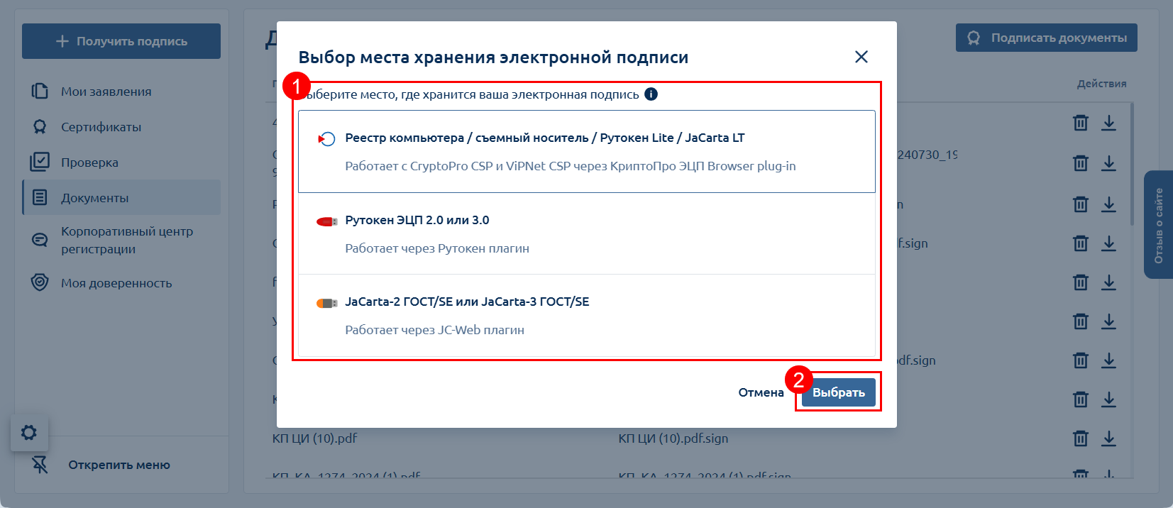 Выберите место хранения электронной подписи (1) и нажмите Выбрать (2):