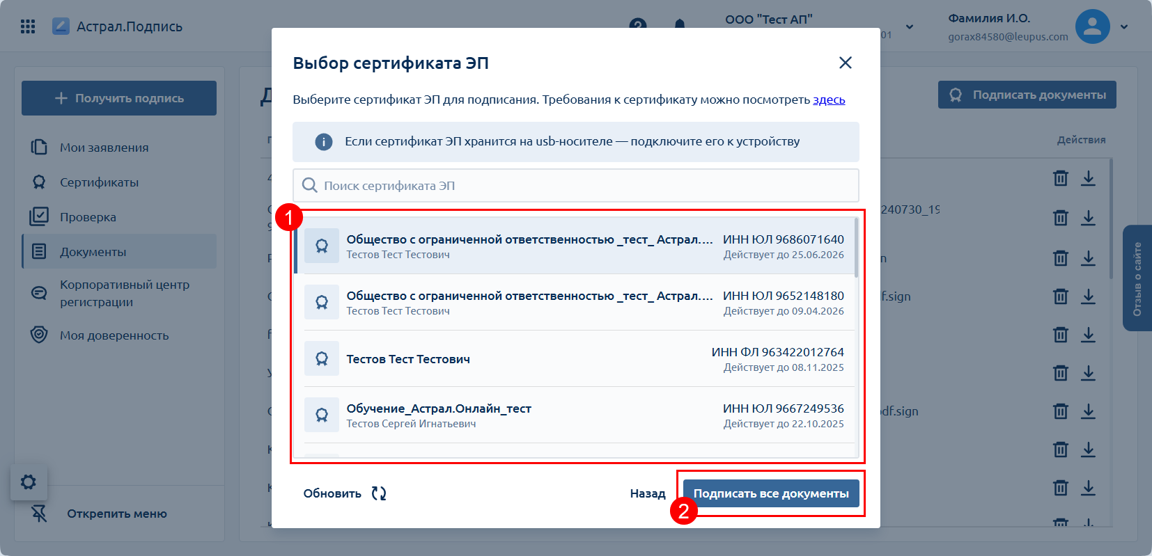 Выберите сертификат для подписания (1) и нажмите кнопку Подписать все документы (2):