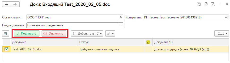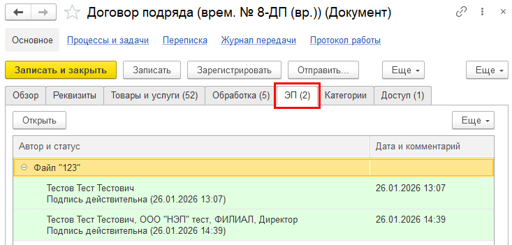 После подписания электронного документа в карточке документа 1С обновятся данные о подписании документа автоматически.