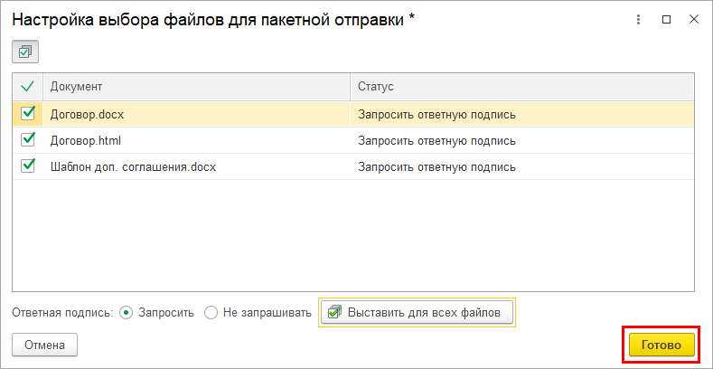 Если документ 1С содержит несколько файлов, при отправке откроется окно выбора файлов для формирования пакета. Выберите нужные файлы, укажите, требуется ли запрашивать ответную подпись контрагента по каждому из них, и нажмите Готово: