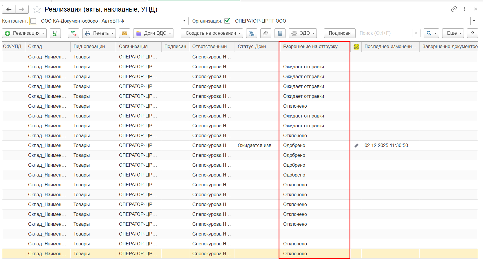 Статусы разрешений на отгрузку можно отслеживать в реестре документов продаж в графе Разрешение на отгрузку: