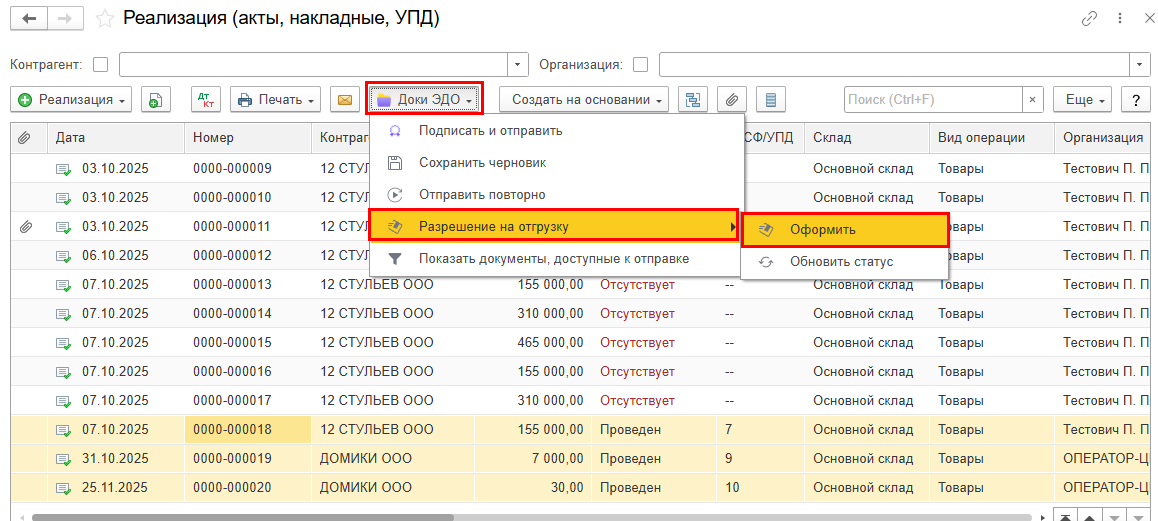 Для отправки разрешения на отгрузку товара из реестра документов продаж выберите один или несколько документов. Нажмите кнопку Доки ЭДО → Разрешение на отгрузку → Оформить: