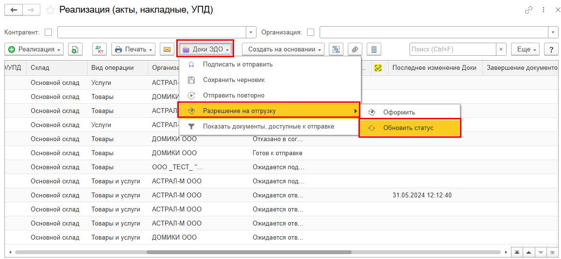 Для обновления статусов разрешений на отгрузку нажмите Доки ЭДО → Разрешение на отгрузку → Обновить статус:
