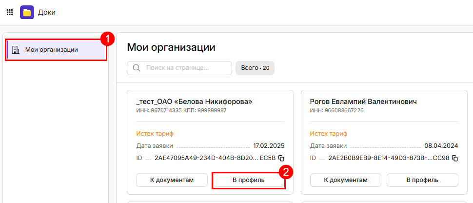 Откройте профиль организации: Мои организации (1) → В профиль (2):