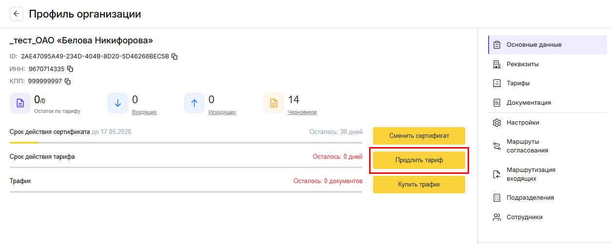 В профиле организации на вкладке Основные данные отображается действующий тариф. Если остаток по тарифу подходит к концу, отправьте заявку на продление тарифа. Для этого нажмите кнопку Продлить тариф: