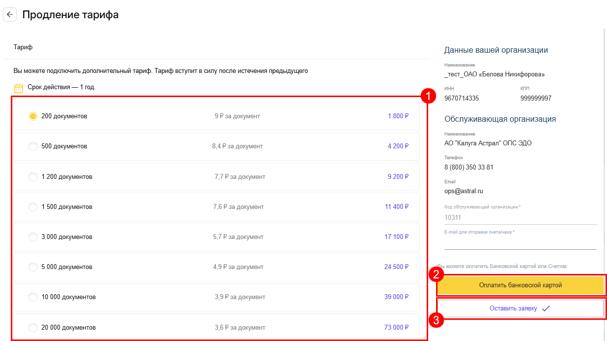 Выберите тариф (1). Оплатите его банковской картой (2) либо счетом, оставив заявку (3):