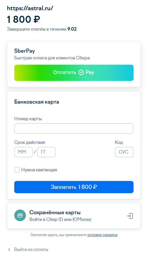 После нажатия кнопки Оплатить банковской картой вы будете перенаправлены в сервис оплаты. Введите реквизиты карты и произведите оплату: