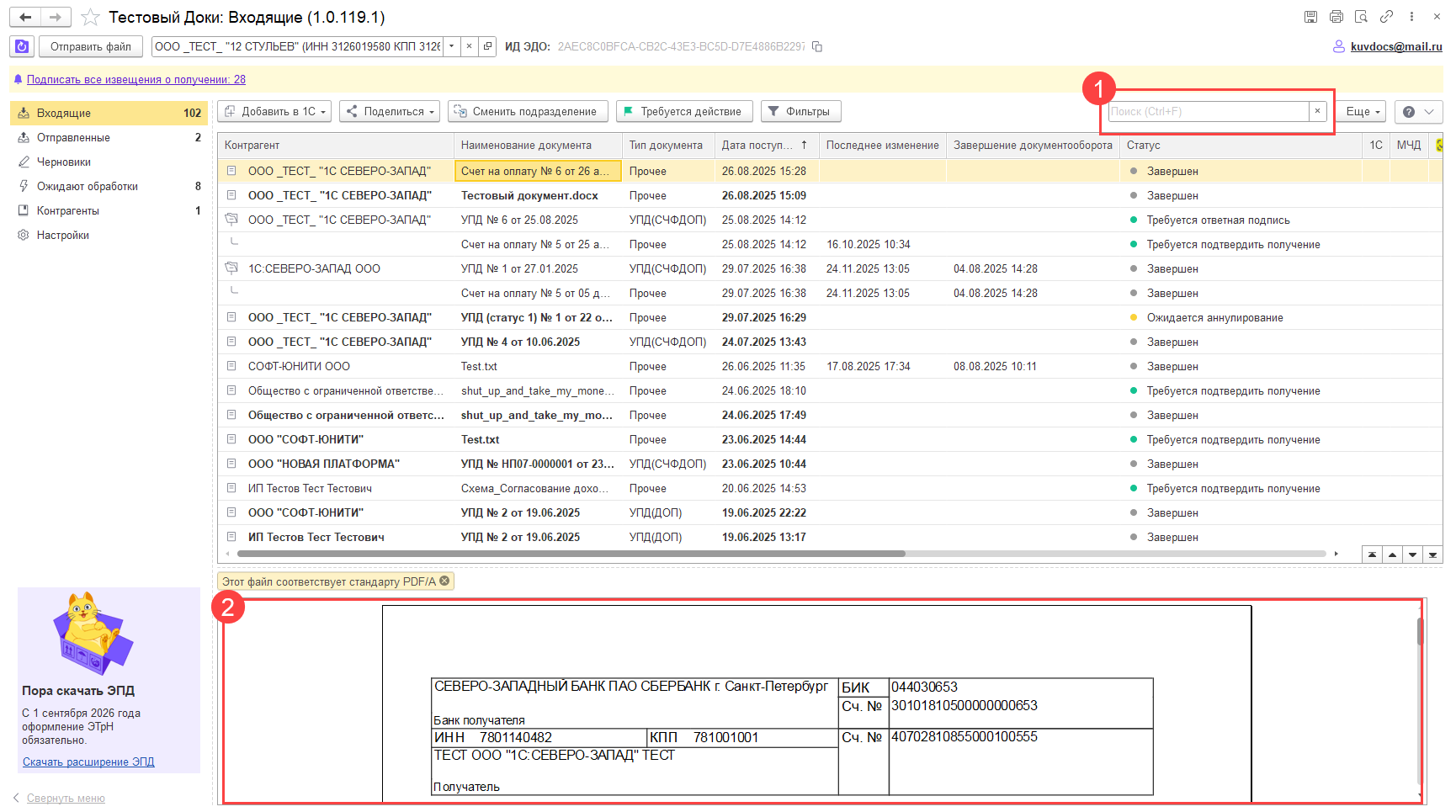 Чтобы найти требуемый документ в списке, воспользуйтесь строкой поиска (1). В нижней части окна отобразится печатная форма выбранного документа (2):