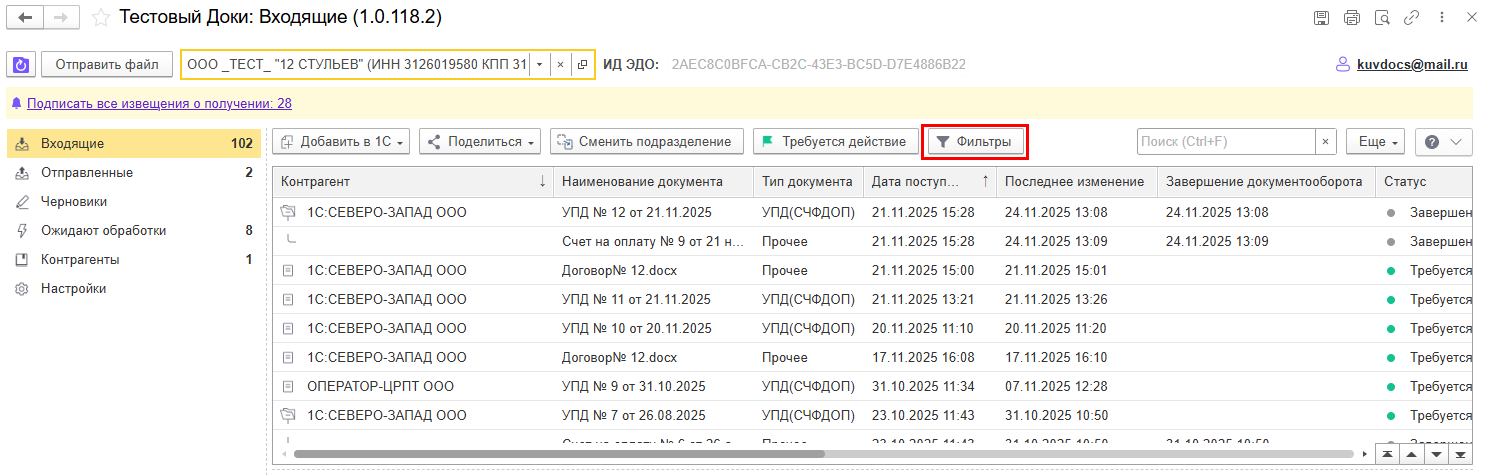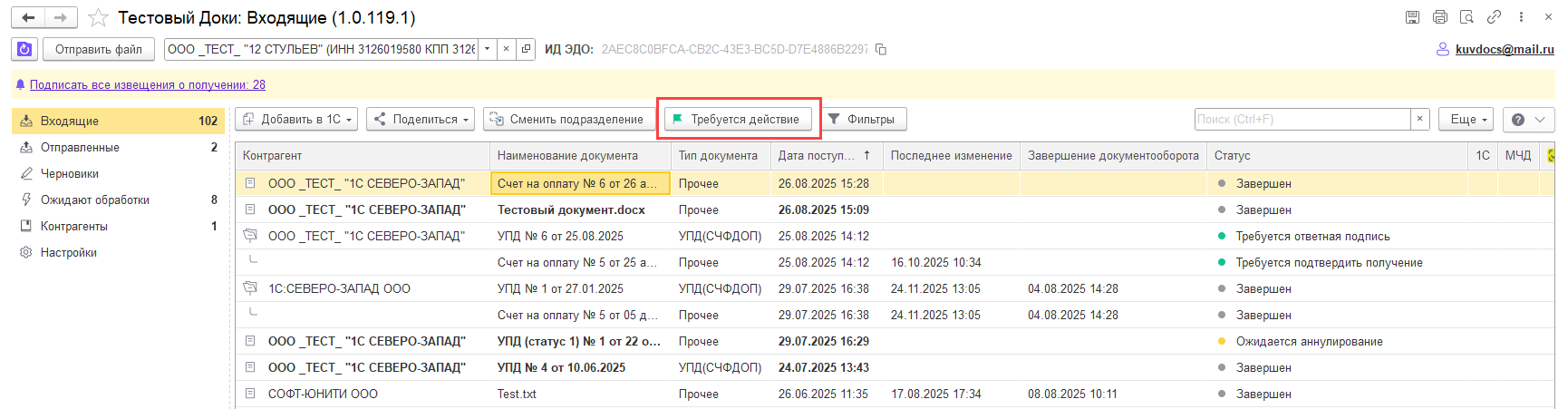 Чтобы в списке входящих документов отображались только документы, которые необходимо обработать, нажмите кнопку Требуется действие:
