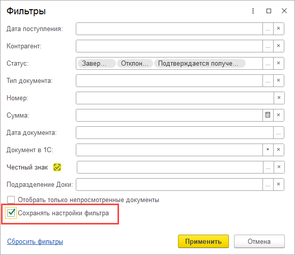 Чтобы настроенный фильтр сохранился и автоматически применялся при следующем открытии Доки, установите чекбокс Сохранять настройки фильтра: