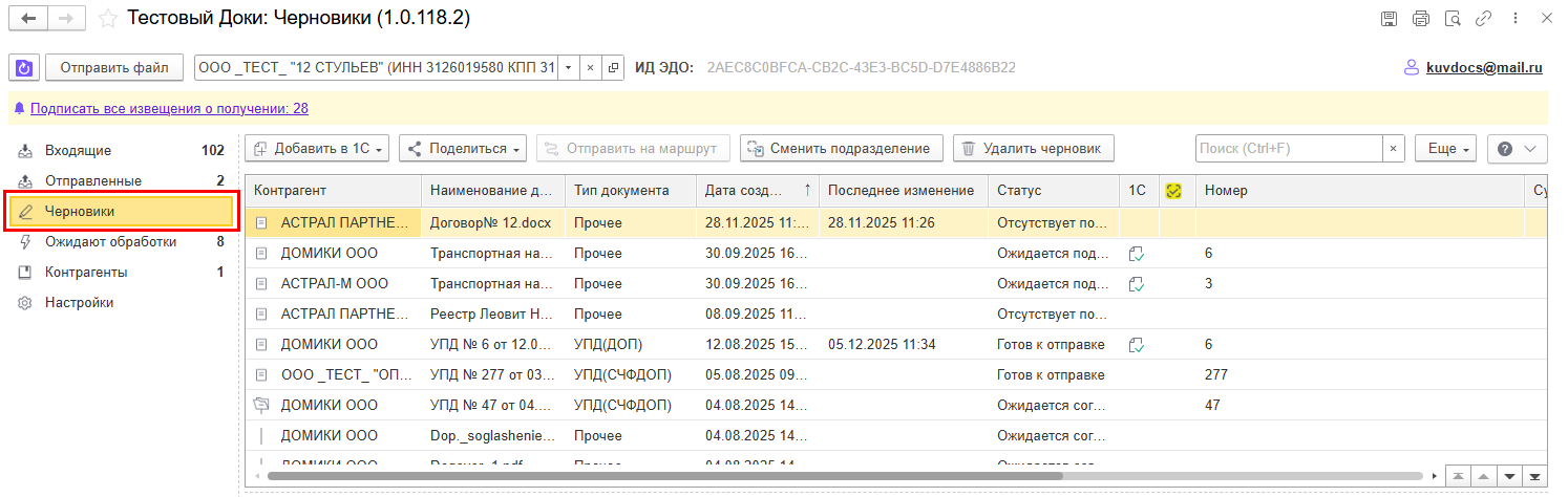 Для просмотра созданных, но неотправленных документов зайдите в реестр Доки ­→ Черновики: