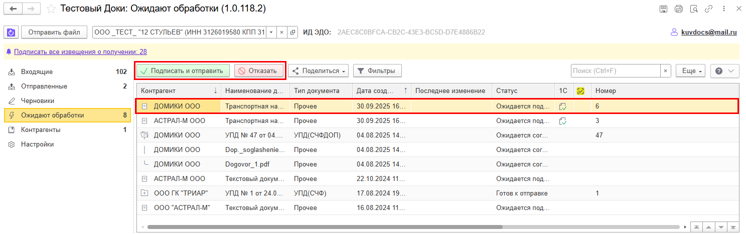 Выберите документ для обработки и нажмите кнопку Подписать и согласовать или Отказать: