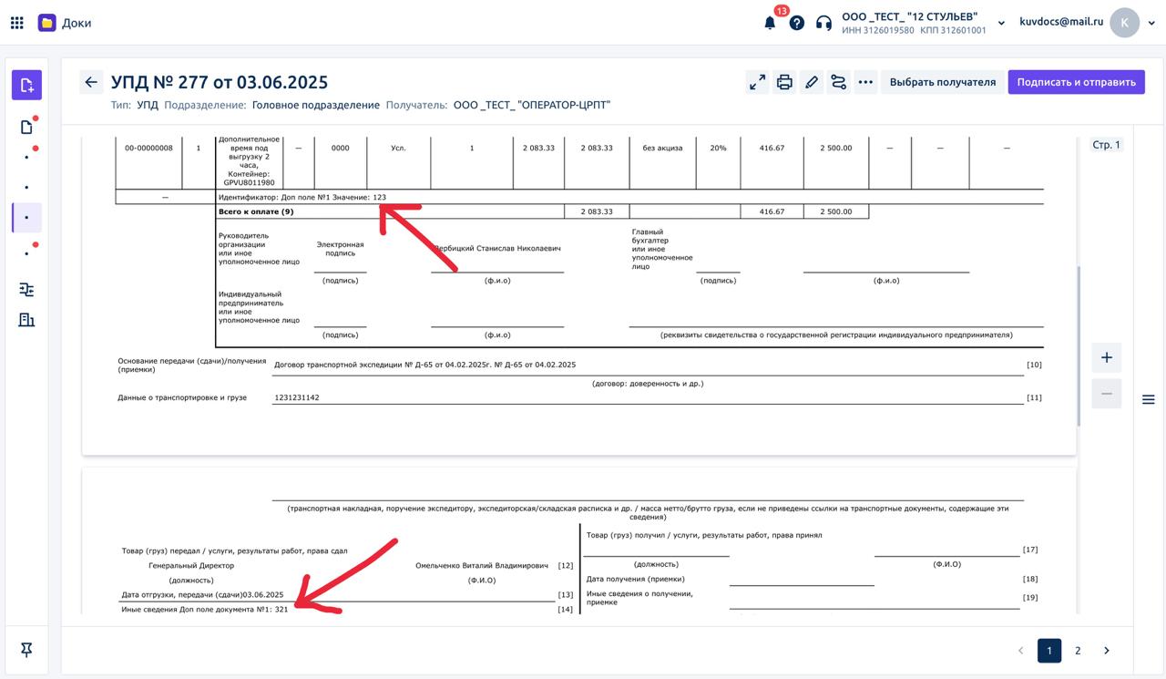 В формализованные документы можно добавлять поля, чтобы предоставить контрагентам дополнительную информацию о сделках и товарах. Они будут добавлены в электронный документ при отправке.