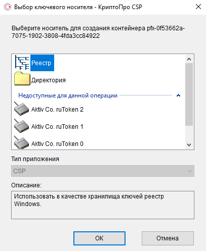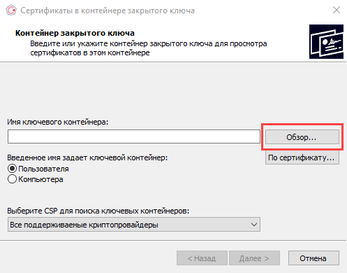 Откроется окно КриптоПро CSP/VipNet CSP. Укажите место хранения контейнера ключей: