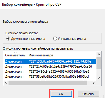 Программа предложит выбрать контейнер. Выделите его и нажмите ОК: