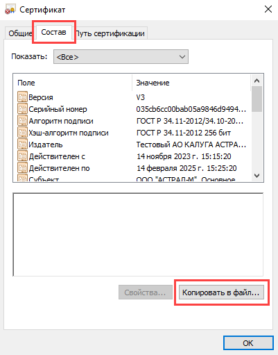 Откроется сертификат. Перейдите на вкладку Состав и нажмите Копировать в файл: