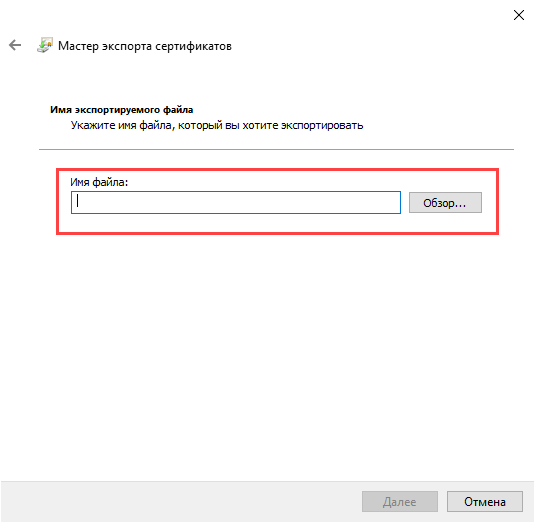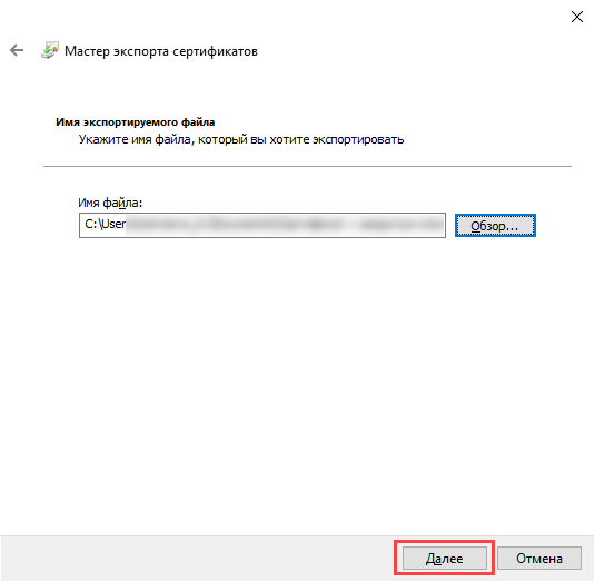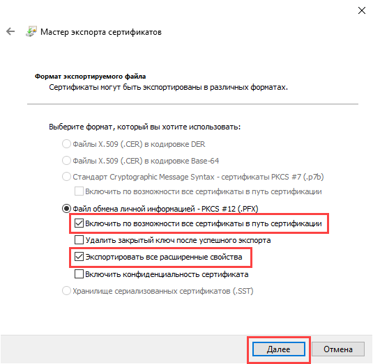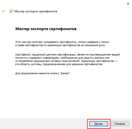 В открывшемся Мастере экспорта сертификатов нажмите Далее: