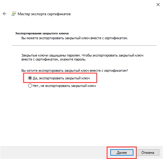 Установите чекбокс Да, экспортировать закрытый ключ. Нажмите Далее: