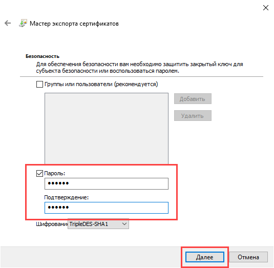 Установите чекбокс Пароль и обязательно задайте пароль для экспортируемого файла. Он понадобится при установке. Нажмите Далее: