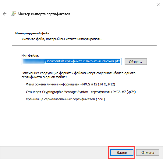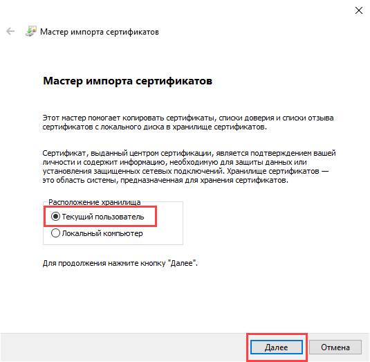 Откройте экспортированный ранее PFX-файл. Запустится Мастер импорта сертификатов. Выберите хранилище Текущий пользователь и нажмите кнопку Далее: