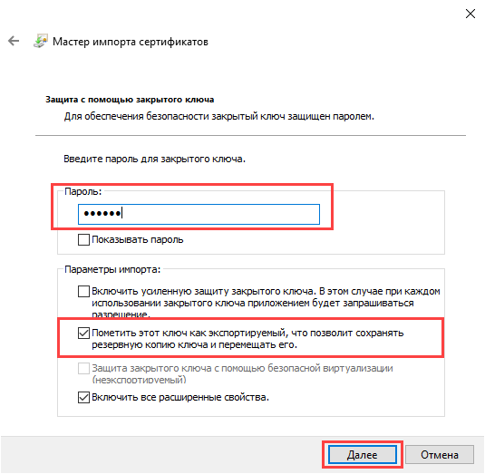 Введите пароль, который был указан при экспорте. Установите чекбокс Пометить этот ключ как экспортируемый, что позволит сохранять резервную копию ключа и перемещать его. Иначе в дальнейшем контейнер нельзя будет скопировать. Нажмите Далее: