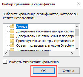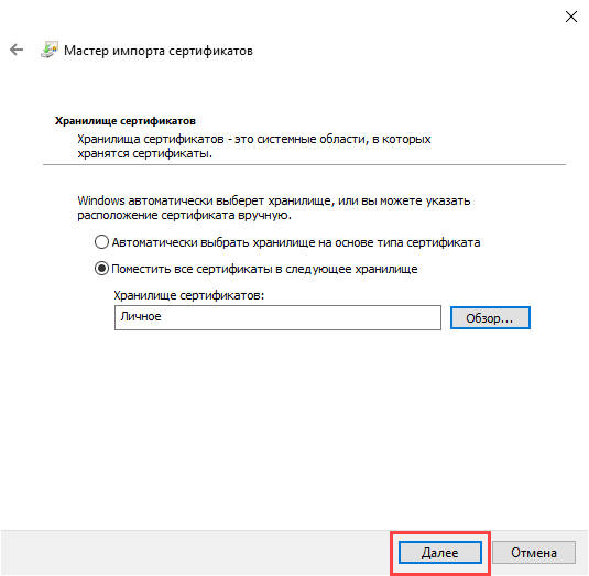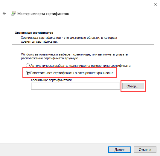 Выберите пункт Поместить все сертификаты в следующее хранилище, нажмите кнопку Обзор: