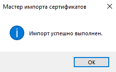 Затем укажите пароль от контейнера. После этого появится сообщение об успешном импорте сертификата:
