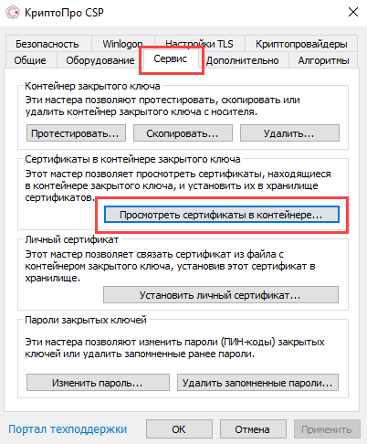 Откройте сертификат в программе КриптоПро CSP/VipNet CSP. Для этого перейдите на вкладку Сервис и нажмите кнопку Просмотреть сертификаты в контейнере: