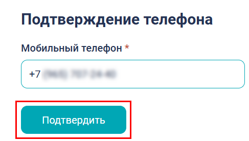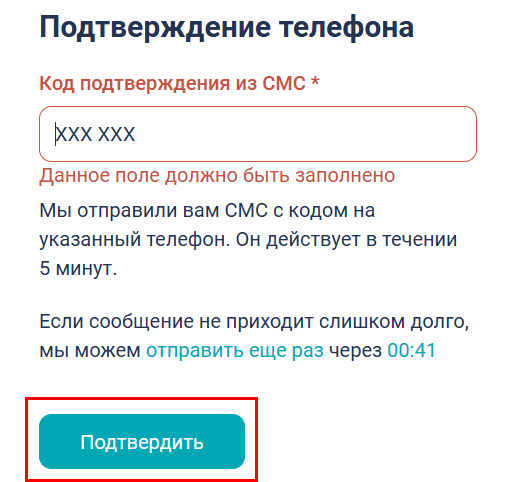 На указанный номер телефона будет отправлено СМС с кодом. Введите код в соответствующее поле и нажмите Подтвердить: