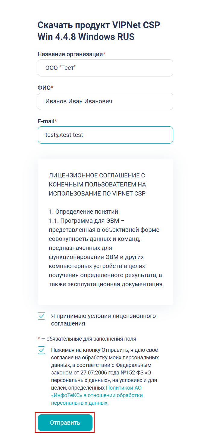 Заполните открывшуюся форму, примите условия лицензионного соглашения и согласие на обработку персональных данных. Нажмите кнопку Отправить: