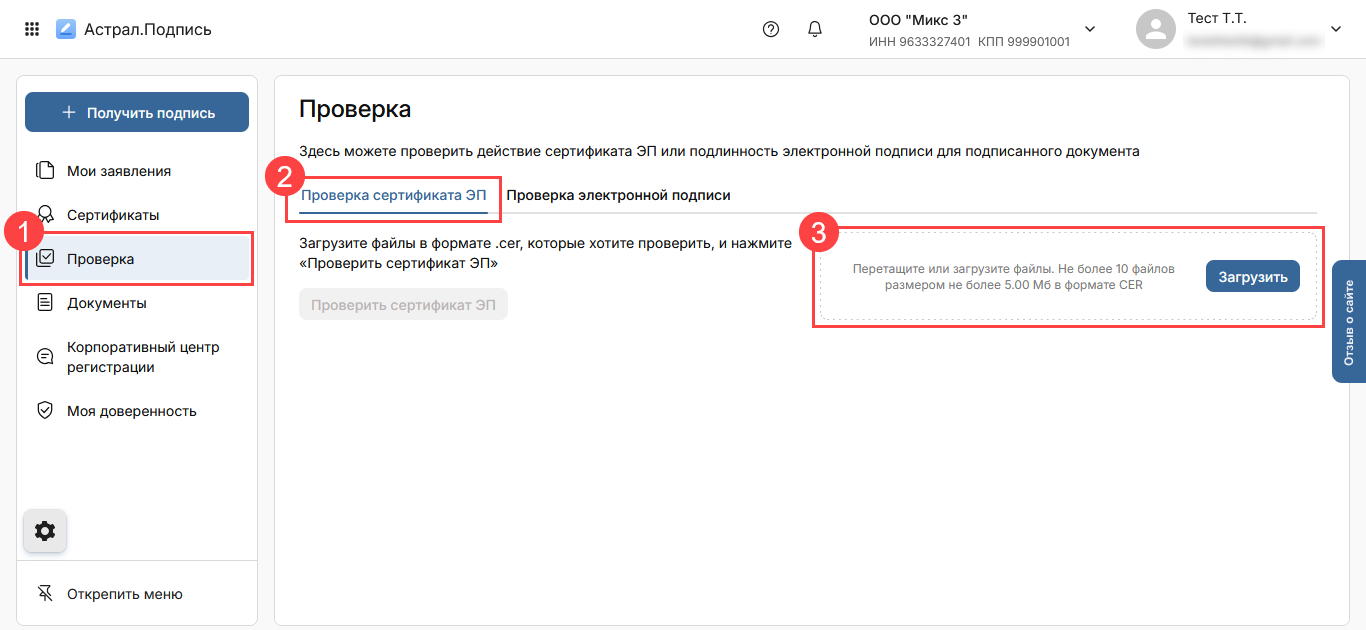 Для проверки сведений о сертификате откройте раздел Проверка (1) → Проверка сертификата ЭП (2). Перетащите файл в формате CER или выберите файл, нажав кнопку Загрузить (3):