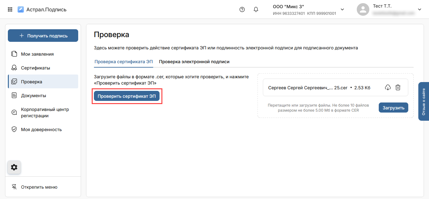 Нажмите кнопку Проверить сертификат ЭП: