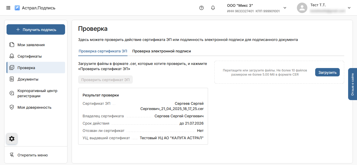 Астрал Подпись: Проверка сертификата ЭП