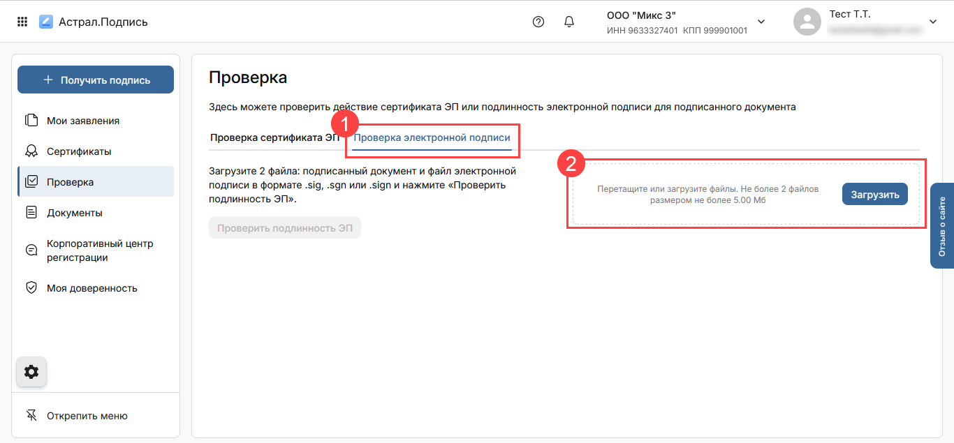 Для проверки подлинности ЭП для подписанного документа откройте вкладку Проверка электронной подписи (1). Загрузите 2 файла: подписанный документ и файл электронной подписи в формате .SIG, .SGN, .SIGN (2):