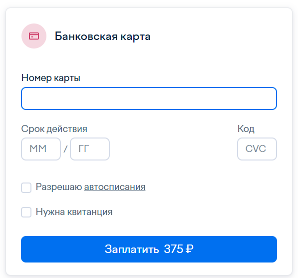 В сервисе оплаты введите реквизиты карты. Затем произведите оплату, нажав кнопку Заплатить: