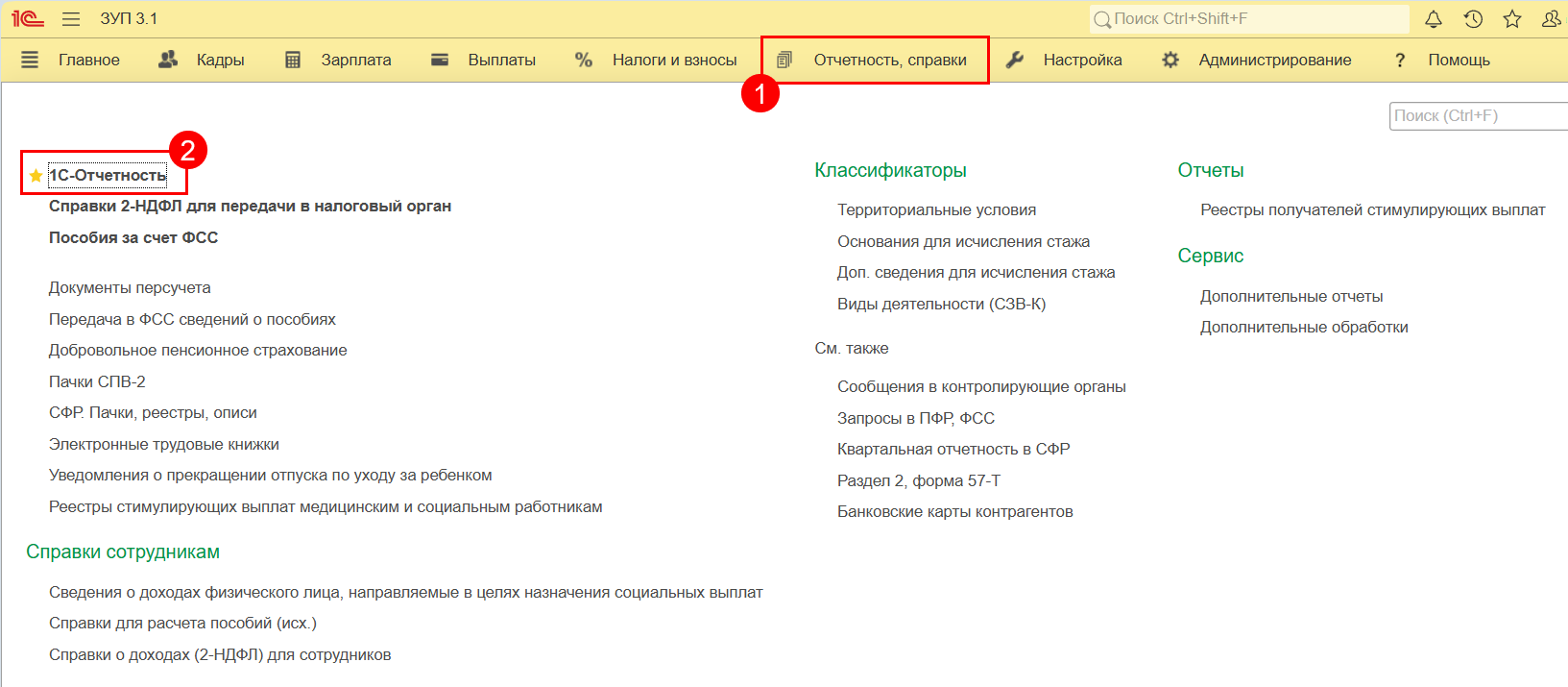 Для создания и отправки заявления на продление перейдите в пункт меню Отчетность, справки (1). В открывшемся окне перейдите в раздел 1С-Отчетнотсть (2):