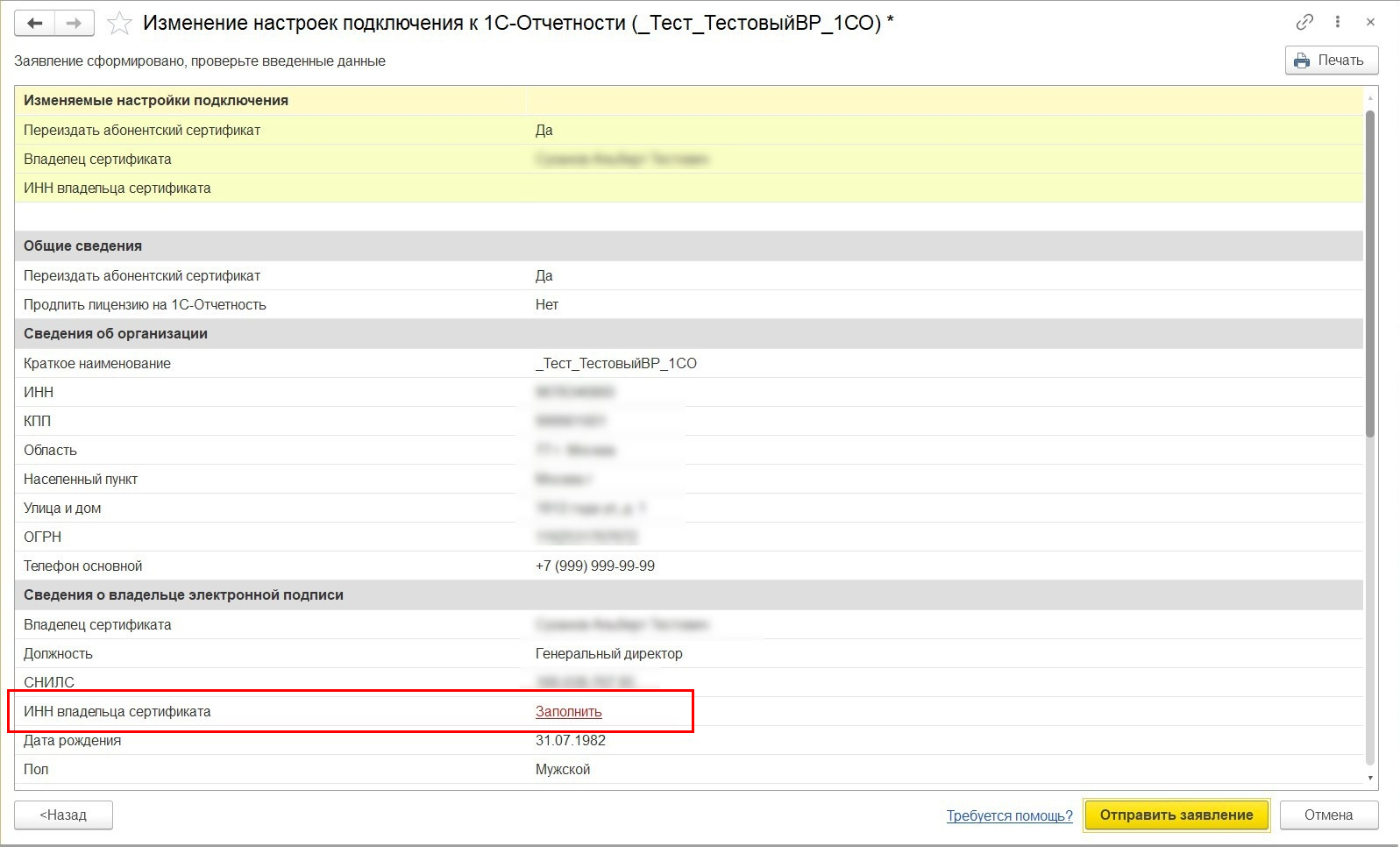 Далее проверьте правильность заполнения информации об организации, для которой необходимо сформировать заявление: